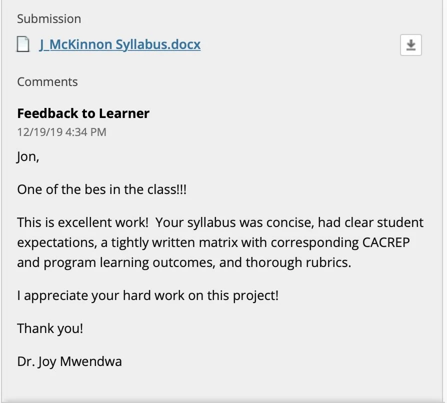 Artifact 10 is the feedback I received from my students during my teaching internship, while artifact 11 is feedback from Dr. Ford, my supervisor for my internship. I was assessed for my ability to feel the role of a counselor educator in the classroom (a), teach effectively (b), and deliver a lesson (d). Since this class was conducted online, my methods of teaching online would have played a role in my evaluation (e). I was also evaluated on how I assessed my students (g).